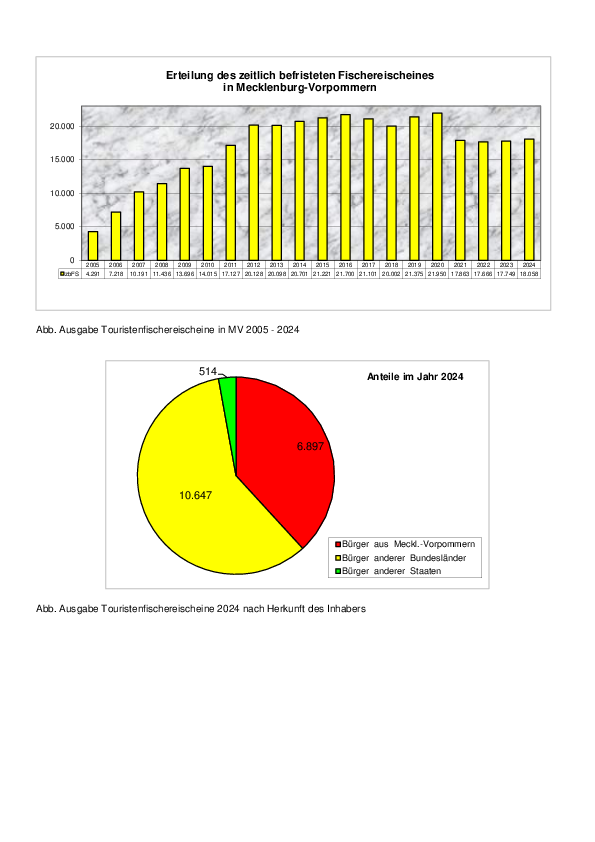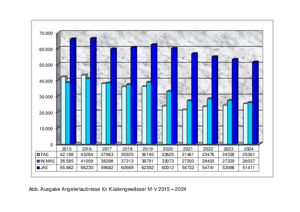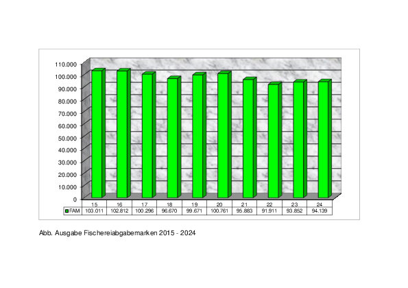 In der anliegenden Grafik ist die Ausgabe der Fischereiabgabemarken (FAM) im Zehnjahreszeitraum dargestellt. Es ist zu beachten, dass die Anzahl der ausgegebenen FAM auch die Küstenfischer (ca. 450) und Binnenfischer (ca. 250) enthält; in der Gesamtzahl auch die FAM der erteilten Touristenfischereischeine enthalten.