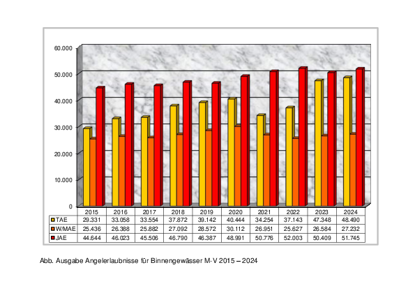 Die von den Fischereiberechtigten der Binnengewässer des Landes M-V(durch die Eigentümer, Pächter, Fischereibetriebe, Angelvereine/-verbände etc.) ausgegebenen Angelerlaubnisse sind in der unten angefügten Abbildung dargestellt.