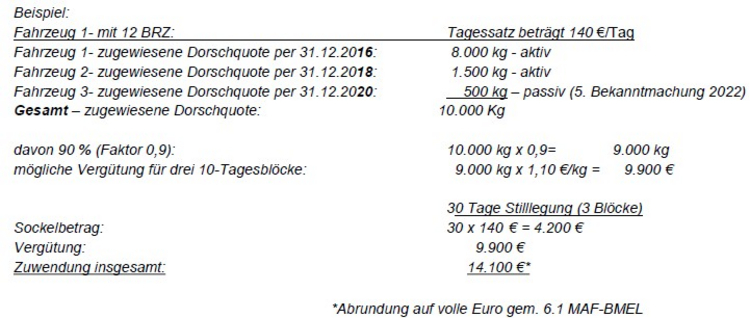 Je Stilliegetag (Einstellung der gesamten Fischereitätigkeit mit allen Fahrzeugen) wird 1/30 der insgesamt möglichen Vergütung gewährt: