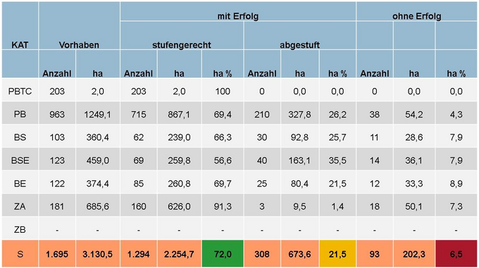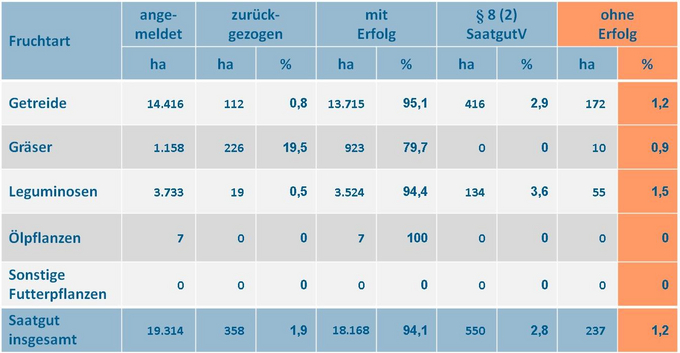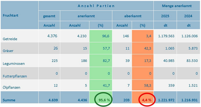 Die Anerkennungsrate beträgt 94,1 %, wobei die 2,8 % mit §8,2 SaatgutVO beurteilten Flächen hinzugerechnet werden können, da bei der Aufbereitung der betreffenden Partien die Besätze zu fast 100% herausgereinigt werden.